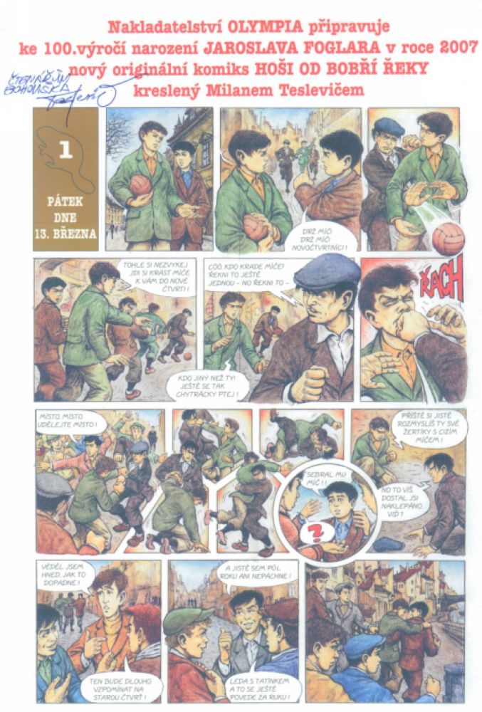 S prvními šesti originály stran připravovaného komiksu Hoši od Bobří řeky kresleného Milanem Teslevičem se od včerejšího dne až do neděle mohou seznámit návštěvníci stánku Olympie na pražském holešovickém Výstavišti na knižním veletrhu Svět knihy. Kniha připravovaná k vydání v květnu 2007 se sto šesti pokračování na sto dvaceti stranách vyjde u příležitosti 100. výročí narození Jaroslava Foglara.