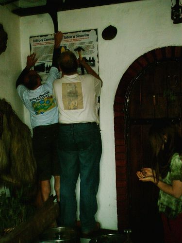 Sraz účastníků byl v terminálu autovlaků 20. července v osm hodin večer. Sešli jsme se všichni: Alpín, Nahville, Filip, Jíra, Krizmen, Martin R., Tomáš N, Anežka a Pepa s manželkou Zdeňkou. Nalodění do autovlaku proběhlo bez problémů, a tak Slávek mohl naši expedici před lůžkovým vagónem zahájit předáním map a expedičních triček. Cílem naší výpravy byla nejenom místa spojená s Jaroslavem Foglarem na Podkarpatské Rusi a na Slovensku, ale stranou nezůstaly také další přírodní a kulturní pozoruhodnosti obou zemí. Cesta rychlíkem Euronight proběhla rychle, většina účastníků ji prospala. Někteří ale nevydrželi a nad ránem tak spatřili z okének vlaku Vysoké Tatry. Ráno jsme projeli železniční křižovatku Kysak a již brzo zakotvili na nádraží v Košicích, které se staly výchozím bodem naší autotrasy. Prohlídka města netrvala ani hodinu a za krásného počasí jsme tak ještě dopoledne vyjeli směr slovensko-ukrajinské hranice. Radost nám ale hned zpočátku se pokusili zhatit slovenší policisté, kteří jednomu z našich řidičů napálilil 50 euro pokutu. Zato na hranicích jsme slovenskou kontrolou projeli v podstatě bez problémů. Horší byla situace na ukrajinské straně. Byrokracie, laxnost, hraní na důležité - to vše nás doslova naplnilo zoufalstvím. Kontrola zavazadlových prostorů, vysvětlování účelu naší cesty (vezli jsme s sebou obrovského ježka v kleci, což někteří celníci příliš nechápali...) nám připomenula dobu na našich hranicích před 20 lety. Nejstarší účastník výpravy se jim dokonce zdal natolik nedůvěryhodný, že ho donutili k vyplnění celního prohlášení. Oddychli jsme si až v Užhorodě, kde jsme zastavili před místním obchodním centrem, kde jsme si vyměnili ukrajinské peníze - hřivny a rozkoukali se po cenách. Přitom jsme hned objevili zdejší nápoj KVAS, který se stal symbolem výpravy - pro někoho pozitivní, někteří účastníci však na něj budou mít spíše negativní zážitky ;-) Cesta auty dále směřovala do české čtvrti Užhorodu, která připomíná naše Dejvice, kde se nachází busta TGM a dále ke zdejšímu nově postavenému vlakovému nádraží v retro stylu, které je prý nejmodernější v celé východní Evropě. Tam jsme ochutnali další zdejší specialitku - výborné teplé plněné pirohy. Užhorod je poměrně velké město, nebylo tedy divu, že jsme se zde navzájem v autech ztratili, ale na nejbližší benzínce již bylo všechno v pořádku. To už jsme "tankovali plnou" - ceny benzínu jsou zde v poměru o třetinu nižší než v České republice. A pak hurá přes Mukačevo do Chustu. Na nádraží v Chustu to všechno před 71 lety (25. června 1938 ve 12,30) začalo. Po strastiplné cestě sem tehdy dojel vlak s čtyřosým vagonem rychlíkového typu CDa. Odtud byl náklad přeložen na stěhovací vůz a děti odjely dvěma autobusy do Sinovíru. K tábořišti potom byly sjednány koňské potahy. Byl to zajímavý pocit, konzultovat s Jírou události, jichž se před dávnými lety účastnil. Náhlédli jsme do čekárny, vyfotili si projíždějící osobní vlak a vychutnávali atmosféru provinčního ukrajinského městečka. Naše cesta pokračovala směrem do Koločavy, kterou proslavily osudy slavného loupežníka Nikoly Šuhaje, které zpracoval spisovatel Ivan Olbracht. Cesta byla dlouhá a těžká, zatímco doposud silnice byly poměrně slušné, tak do Koločavy jsme dali našim autům hodně zabrat. Míjeli jsme přitom koňské potahy, dávali jsme přednost krávám vracejícím se z pastvy a zvyšující se nadmořská výška s sebou přinášela i vlhkost a srážky. Posledních několik kilometrů jsme doslova klopýtali přes kameny i díry přes celou silnici po několik hodin. Přitom ale bylo možné obdivovat nádherná údolí a božskou karpatskou přírodu. K četnické stanici do Koločavy jsme dorazili až za tmy. Sice jedna babička ze sousedství nám nabízela mnohem levnější nocleh, ale my jsme neodolali a vyspali se v místech, kde četníci debatovali nad Nikolovým osudem. Četnická stanice je dnes spíše penzión s restaurací pro české turisty, ale to nám příliš nevadilo, protože jsme byli poměrně unavení z dosavadní cesty a čekal nás další náročný den. Pochutnali jsme si na výborném boršči a jakési zapečené kapse s bramborami. K tomu jsme většinou zapíjeli kvasem. Usnuli jsme spánkem spravedlivých krátce po půlnoci. Ráno nás přivítal bylinkový čaj a speciální ukrajinská specialita k snídani - tokan s bryndzou. Jinak tedy kukuřičná kaše s čepičkou zakysané smetany. Boule za ušima jsme zrovna neměli, mnozí z nás si vzpomněli na Mistra Beana a jeho mistrovskou scénku s tatarským biftekem :-))) Den jsme zahájili o chvilku mnohem příjemněji - přibítím zvlástního zalaminovaného plakátu s informacemi v ukrajinštině a češtině o vztahu Jaroslava Foglara k Podkarpatské Rusi. Najdete ho po vstupu do četnické stanice vlevo. Pak nás syn majitelky odvedl do pamětní síně Ivana Olbrachta ve zdejší škole, kde jsme si připomenuli podrobně osud Nikoly Šuhaje. Prohlídka Koločavy potom pokračovala návštěvou hřbitůvku, kde jsme se poklonili památce Nikoly i jeho milé Eržiky. Pochůzkami po Koločavě jsme si všimli zdejšího obrovského ruchu - množství korzujících lidí často oblečených do svého nejlepšího oblečení v družné zábavě a obtěžkáni taškami odněkud někam spěchali. Hned nás to napadlo - trh. A vskutku - na okraji Koločavy u řeky probíhal trh pod širým nebem. Bylo zde možné získat téměř cokoliv od potravin, pečiva, drogistického zboží, oblečení až po živá zvířata, ledničky, plastová okna... Ještě jsme neúspěšně zkusili nahlédnout do zdejšího dřevěného kostelíčku, a pak jsm