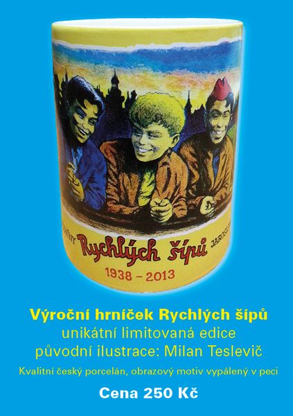 K 75. výročí Rychlých šípů vznikla unikátní limitovaná edice hrníčků s původní barevnou kresbou Rychlých šípů od známého kreslíře a ilustrátora foglarovského světa Milana Tesleviče.