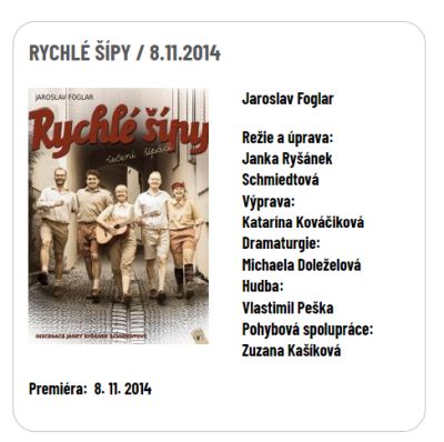 Divadlo Šumperk uvedlo 8. listopadu 2014 hru Rychlé šípy - "dobrodružnou rodinnou inscenaci podle příběhů Rychlých šípů, které bezesporu patří do zlatého fondu české literatury pro mládež."