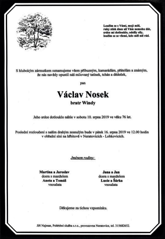 Poslední rozloučení s Václavem Noskem - Windym proběhne v pátek 16. srpna v Neratovicích