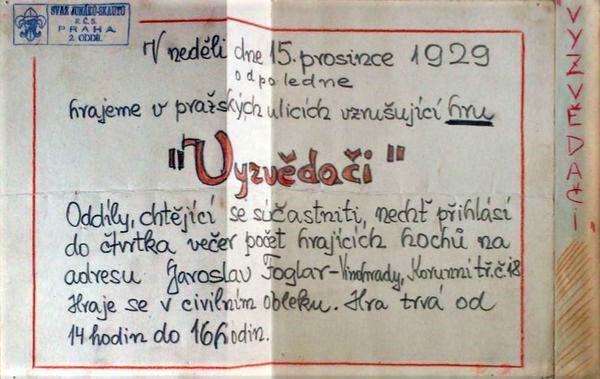 Před devadesáti lety - 15. prosince 1929 - byla neděle. Silně pršelo, přesto se tenkrát odpoledne u skautského domova na pražském Petrském nábřeží sešlo kolem padesáti skautů z několika oddílů. Píšťalka mladého muže, kterého chlapci oslovovali Jestřábe, vyslala signál. To proto, aby mohla v ulicích a uličkách staré Prahy začít hra Vyzvědači.