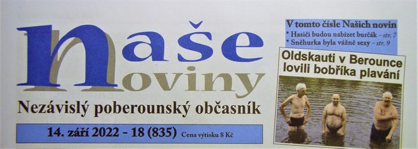 S překvapením i s povděkem jsme zaznamenali obsáhlý článek o každoroční plavecké taškařici akademiků Rokosův memoriál v Nezávislém poberounském občasníku Naše noviny ze 14. září 2022. Článek doprovází na dvou místech také fotografie Jany Adamcové, přímo v textu a dokonce i jako upoutávka na titulní stránce! :-) I při této mediální reflexi našich foglarovských aktivit se účastníci Rokosova memoriálu shodli, jak povedenou taškařicí jsme letos zahájili skautský a akademický rok.