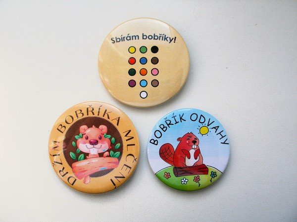 Také tentokrát jsme si mohli prohlédnout několik sběratelských novinek z oboru foglarovských odznaků. Šlo o tři foglarovské buttony – placky a jednu výroční turistickou známku: První z placek – SBÍRÁM BOBŘÍKY nabízí brněnská firma T-SHOCK a znalce překvapí foglarologicky přesným pořadím jednotlivých barevných bobříkových puntíků. Objednat si ji můžete v pěti různých velikostech a s libovolnou barvou podkladu. Další dvě placky zobrazují spíše dětský motiv bobra. Placku DRŽÍM BOBŘÍKA MLČENÍ dodává firma K. A. T. Ja. WIN company s. r. o., a placku BOBŘÍK ODVAHY vám vyrobí ve firmě Šikovnej domek ze Sezimova Ústí.