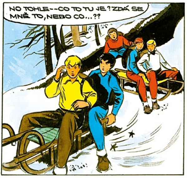 Neumrem na saních, umreme na hnoji! aneb Příběhy Rychlých šípů na sáňkách[ Autor: Milan Lebeda - Alpín | vydáno: včera - 18. 12. 2025 | přečteno 39 | přidat komentář ] Kdo uvidí nejdříve někde sníh, získává bod – chtělo by se v těchto dnech trochu poupravit hříčku Mirka Dušína o koních při cestě Rychlých šípů vlakem na výpravu o svatodušních svátcích.Sníh (ale ani kůň) nebyl viděn nikým z přibližně sedmi desítek účastníků letošního pražského Večera světel u kostela sv. Haštala 17. 12. (o Večeru světel přinese Bohoušek samostatný článek), přesto si přítomní mohli krátce zabojovat o dvojice saní v drobné jednootázkové soutěži. Otázka zněla: Kolik celkem vyšlo kreslených příběhů Rychlých šípů, ve kterých jsou zobrazeny saně? Soutěžní okruh byl určen pouze z klasických příběhů vyšlých v Mladém hlasateli, Vpředu a sešitech Rychlé šípy, přičemž vícestránkový příběh se počítal za příběh jeden. Zřejmě každý si vybaví komiks Rychlé šípy sáňkují o tom, jak Rychlé šípy – konkrétně Rychlonožka – smontují dvoje sáně dohromady, ty se ve vzduchu rozlomí a posádka jedněch saní nakonec skončí na hnojišti za souběžného vyslovení nesmrtelného Červenáčkova výroku citovaného v první polovině titulku tohoto článku. Ale je rychlošípáckých komiksů se sáňkami víc? A pokud ano, kolik? více... Pozdvižení na Františku! Večer světel narušili výtržníci se zahalenými tvářemi[ Autor: Petr Molka | vydáno: včera - 18. 12. 2025 | přečteno 108 | komentáře: 1 | přidat komentář ]Ve středu dne 17. prosince léta Páně 2025 odehrála se na Haštalském náměstí událost, jež klid poklidného zimního podvečera zcela rozervala. Slavnost zvaná Večer světel, svolaná ku připomenutí díla spisovatele Jaroslava Foglara a navštívená více než sedmi desítkami osob, mezi nimiž nechyběly ani děti a mládež nedospělá, nabyla nečekaně rázu téměř bojového. více... Vychází Bohouškův zápisník[ Autor: Bohoušek | vydáno: 17. 12. 2025 | přečteno 380 | přidat komentář ]K 25. výročí vzniku foglarovského magazínu Bohoušek (www.bohousek.cz) vychází Bohouškův zápisník. Na 32 stranách najdete výběr nejzajímavějších textů zveřejněných na Bohouškovi v letech 2000 - 2025. Titulní a závěrečnou ilustraci Bohouškova zápisníku nakreslili Jiří Filípek a Marko Čermák. Slavnostní uvedení publikace bylo velkým překvapením pro účastníky pražského Večera světel (17. 12. 2025).